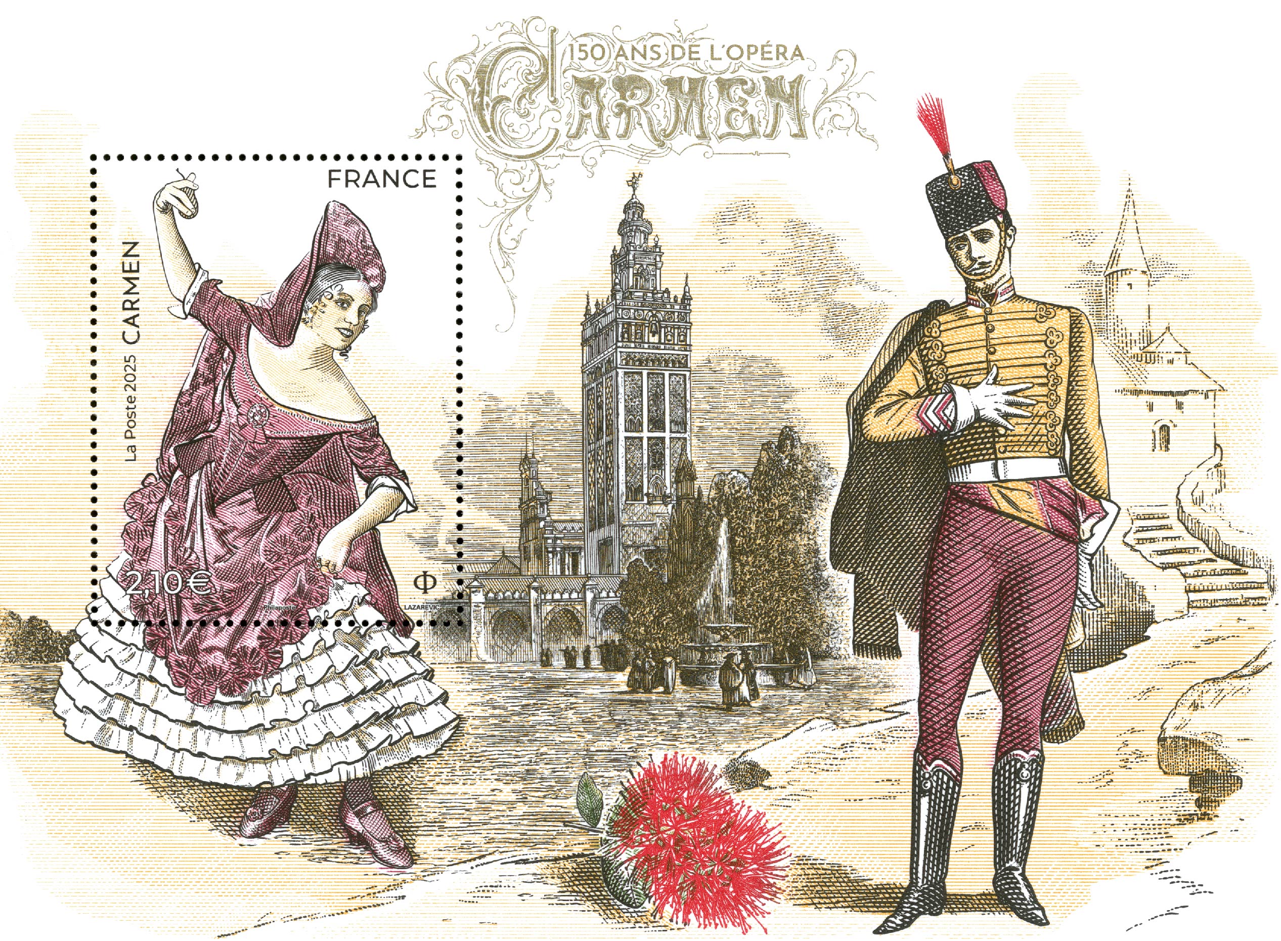 150 ans de l’opéra Carmen, 2025 (création et gravure de Sarah Lazarevic, impression taille-douce, d’après d’après photos Ebon Theodora Vilhelmina Strandin dans le rôle de Carmen, 1922 © akg-images, Don José, officier de dragons, dessin de Percy Anderson © British Library / Aurimages – Cover of the score of the « Carmen » by Giorgio Bizet © Heritage images / Aurimages – Dessin place de Séville © Alamy / Hemis) (© La Poste/ S. Lazarevic) d’après photo © Stéphane Méril, © Fernand Poncelet architecte, impression taille-douce) (© La Poste / A. Lavergne)